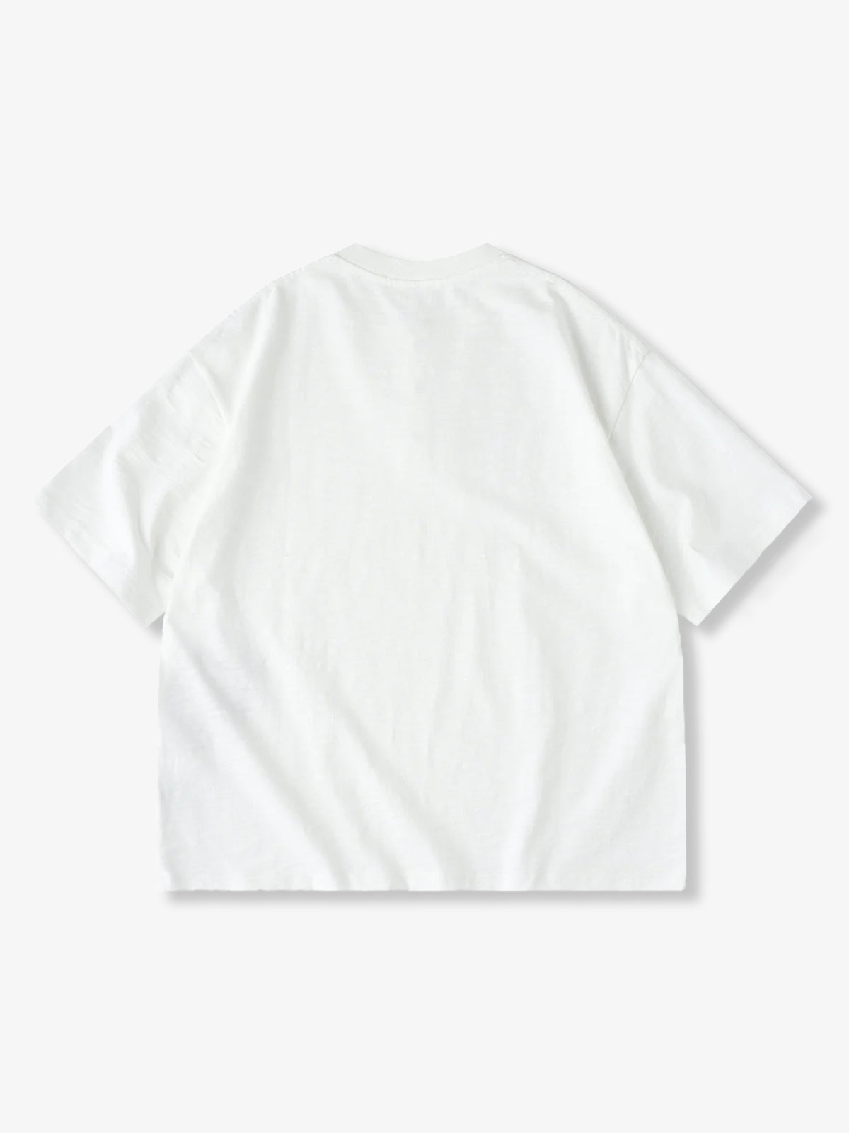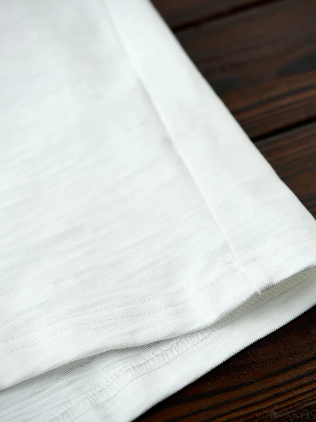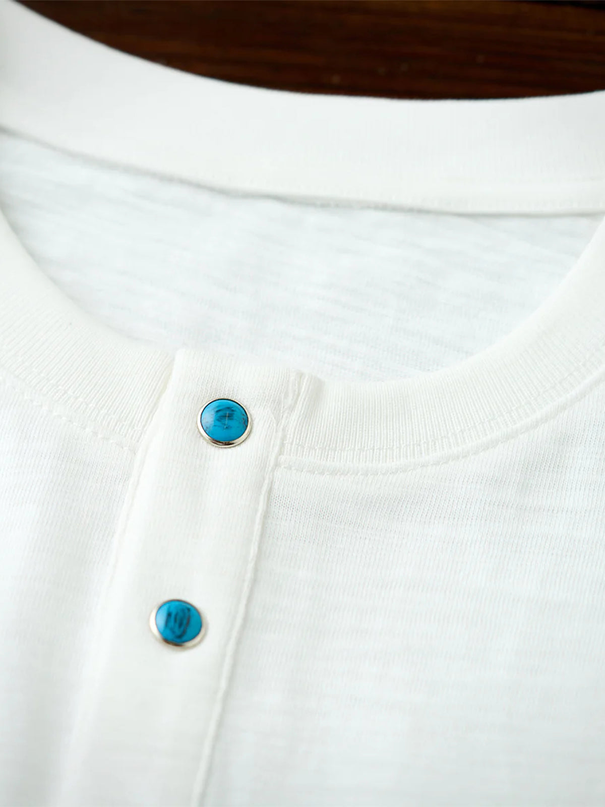 This heavyweight 320g Henley T-shirt is made from slub cotton, known for its vintage-inspired texture. The irregularities in the yarn create a richly expressive fabric that develops character with wear and ages beautifully over time. The chest features turquoise-style snap buttons that serve not only as eye-catching accents but also provide smooth opening and closing. Details evoke a sense of workwear and American vintage. The silhouette offers a relaxed fit for comfort while maintaining a refined appearance without looking too casual.