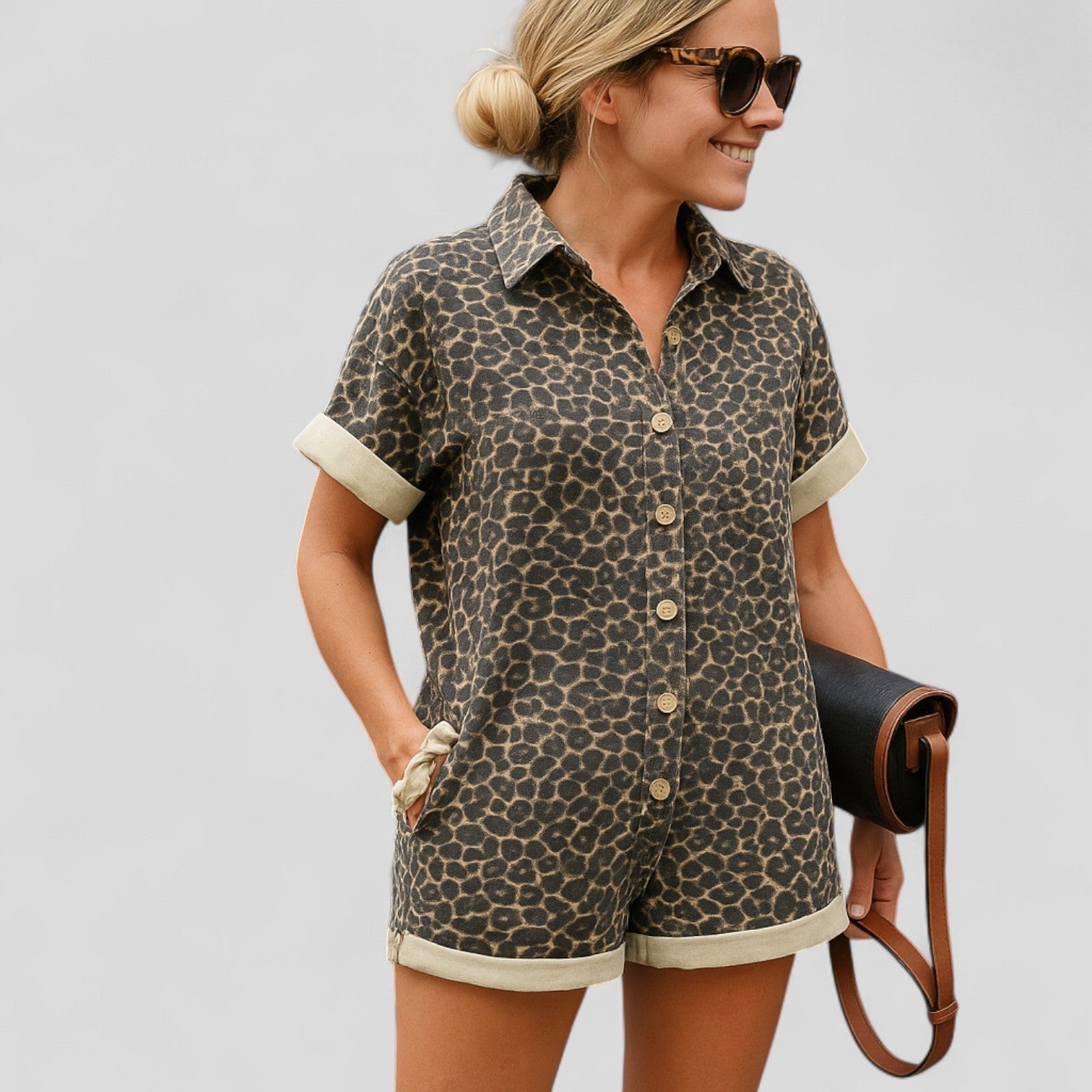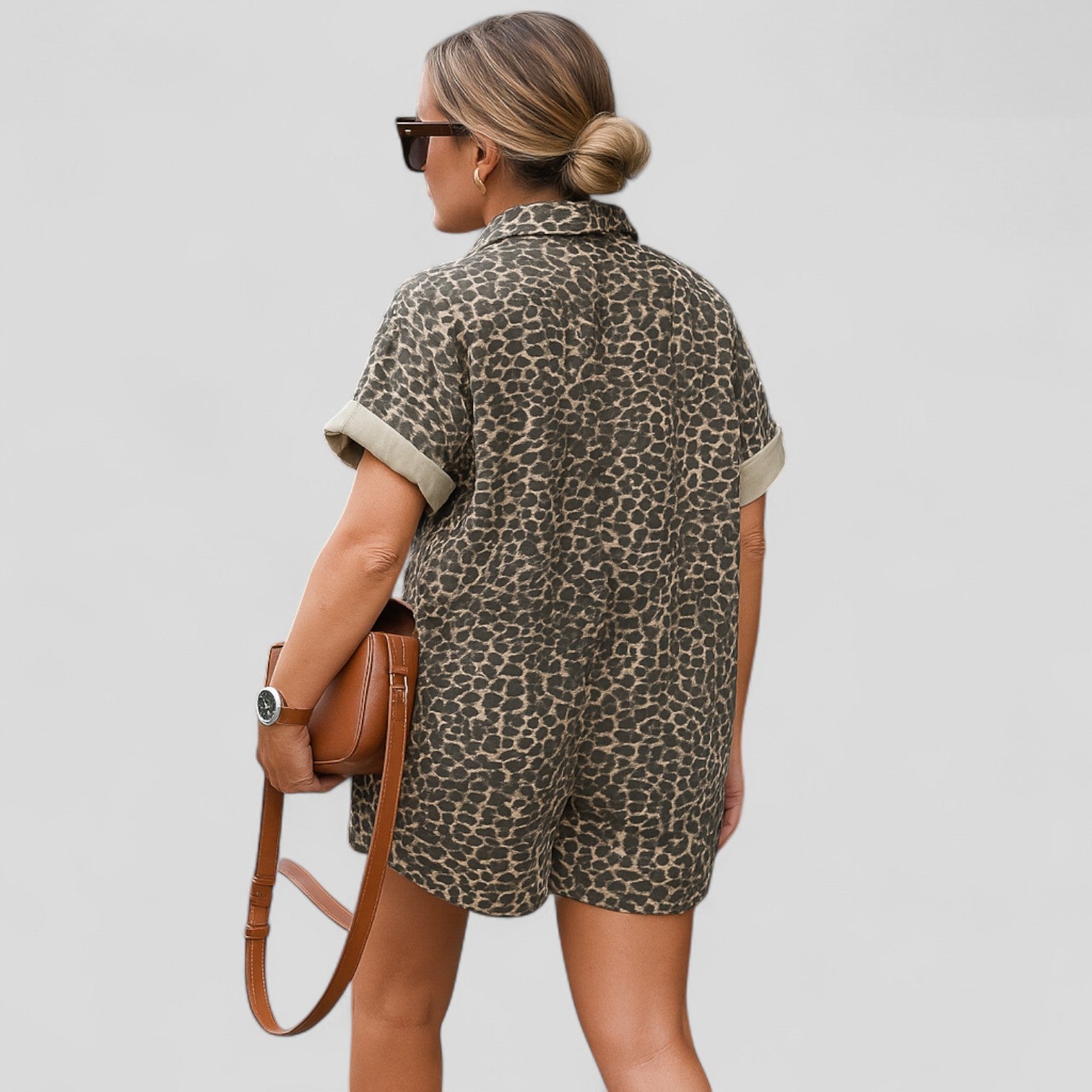 ¡Descubre nuestro estiloso mono de manga corta! Combina comodidad y una audaz declaración de moda con su llamativo estampado de leopardo.