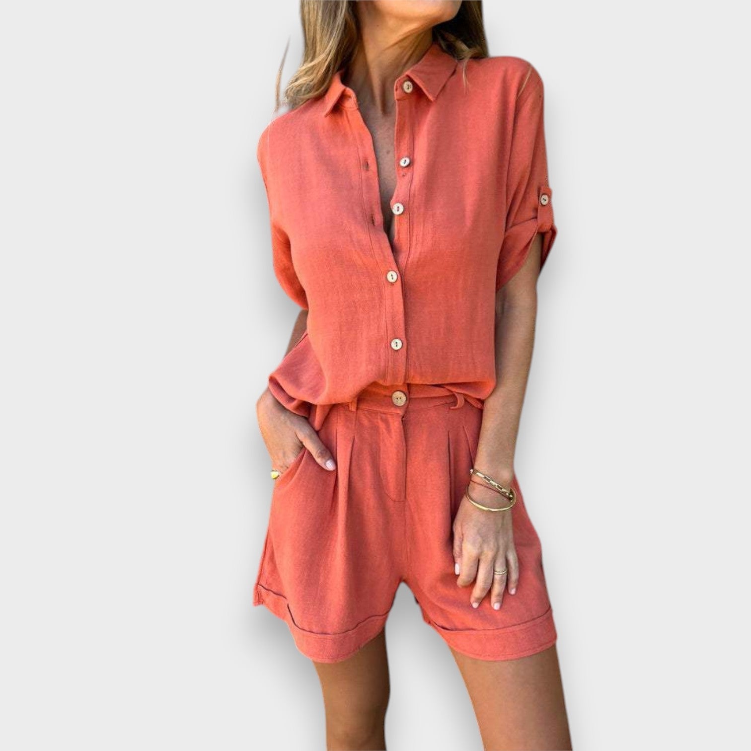 Respira, descansa y siéntete lo mejor posible con Emilia. Este desenfadado conjunto es tu prenda imprescindible para los cálidos días de primavera y las sofocantes noches de verano. Elegante, cómodo y ¡casi agotado!