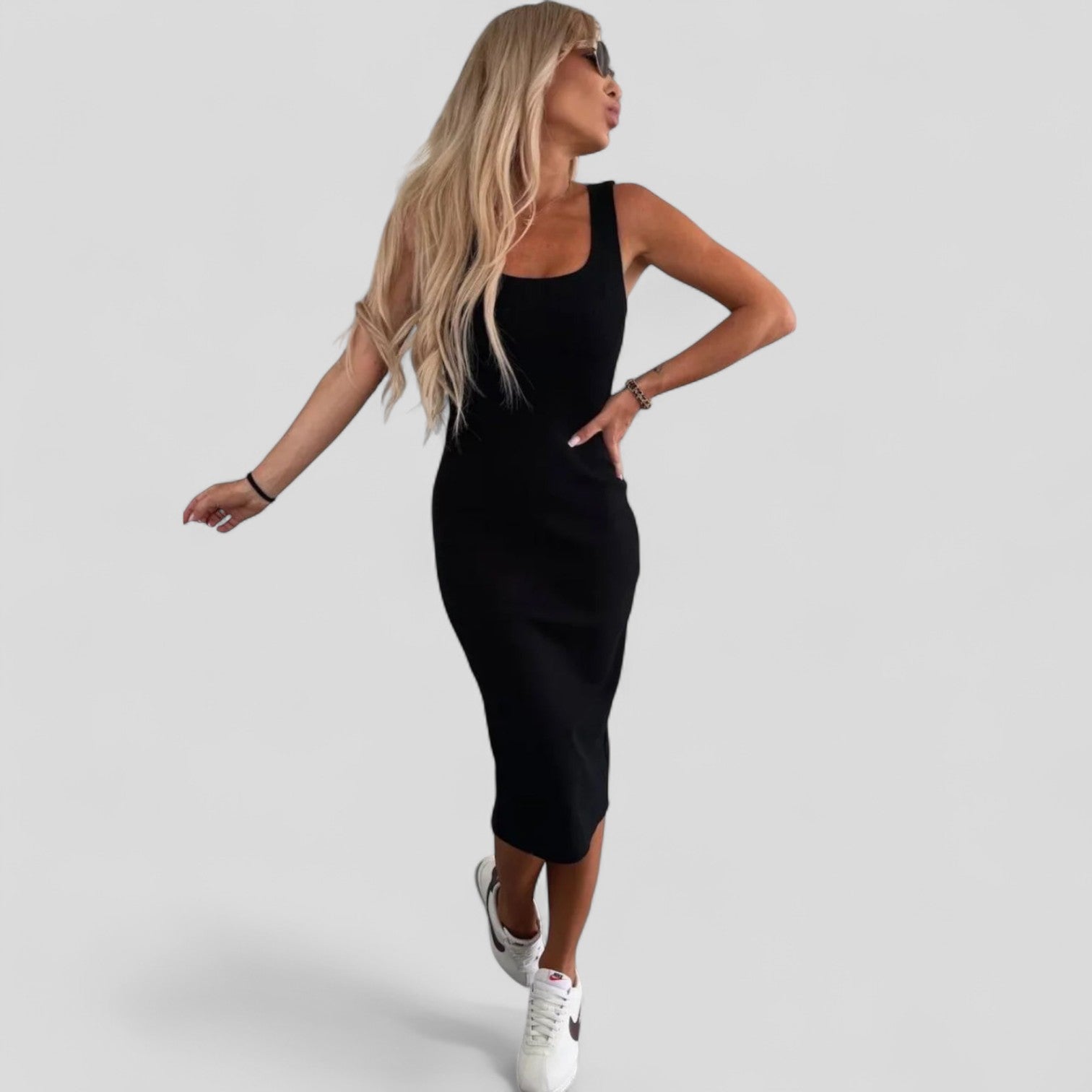 Este encantador conjunto incluye un vestido de punto sin mangas, ajustado y de longitud midi, acompañado de una chaqueta de punto con botones a juego. El material suave y elástico no solo garantiza comodidad, sino que también realza la silueta.