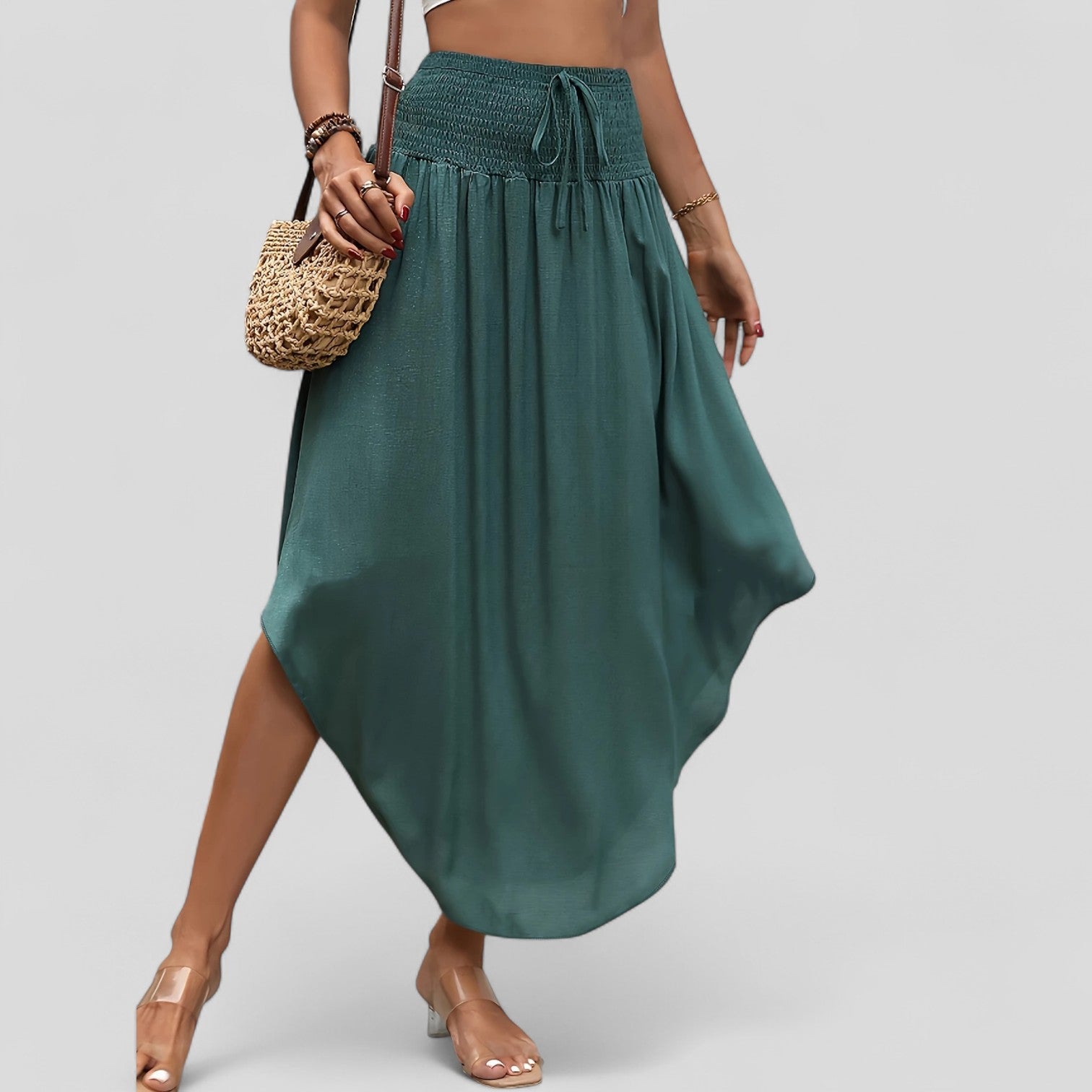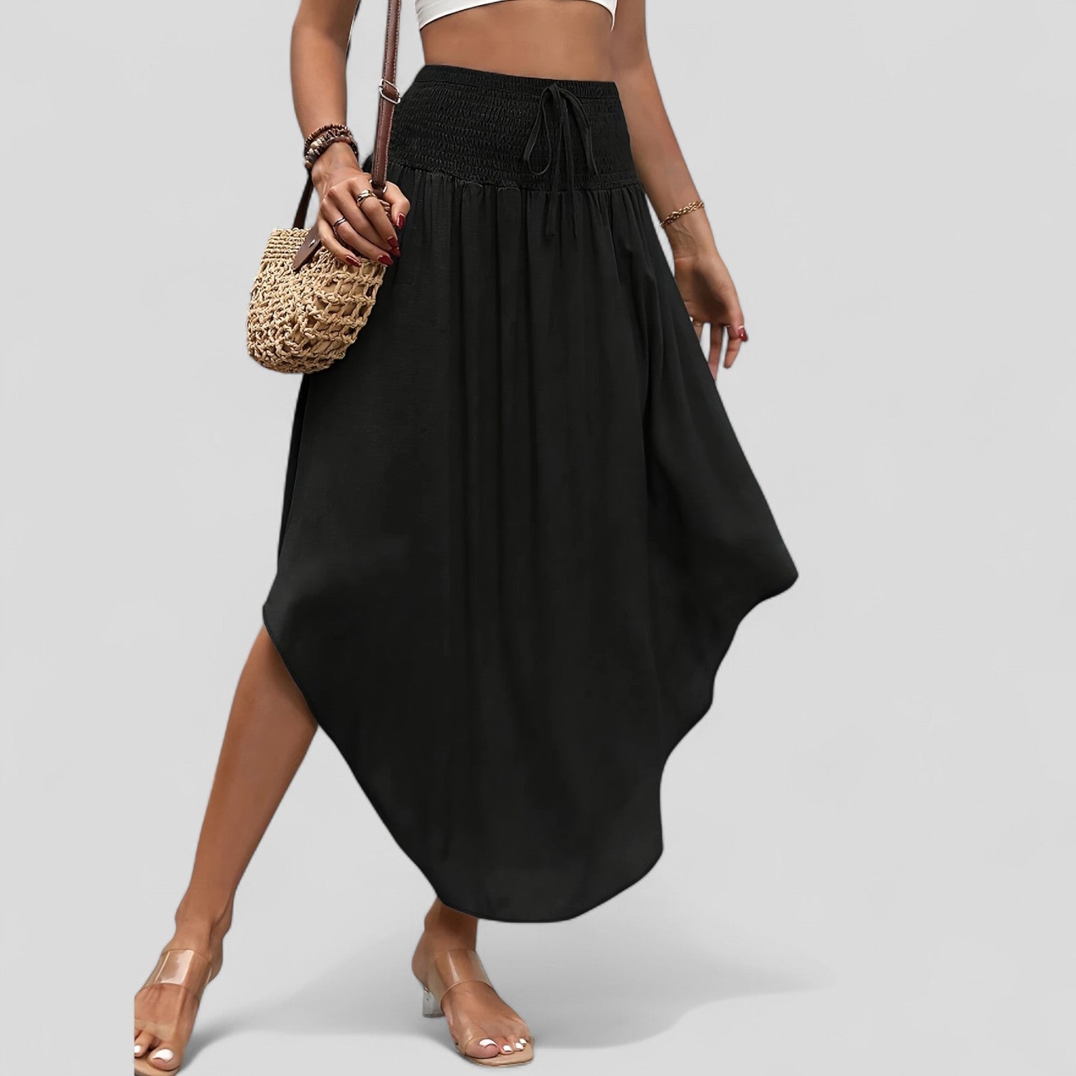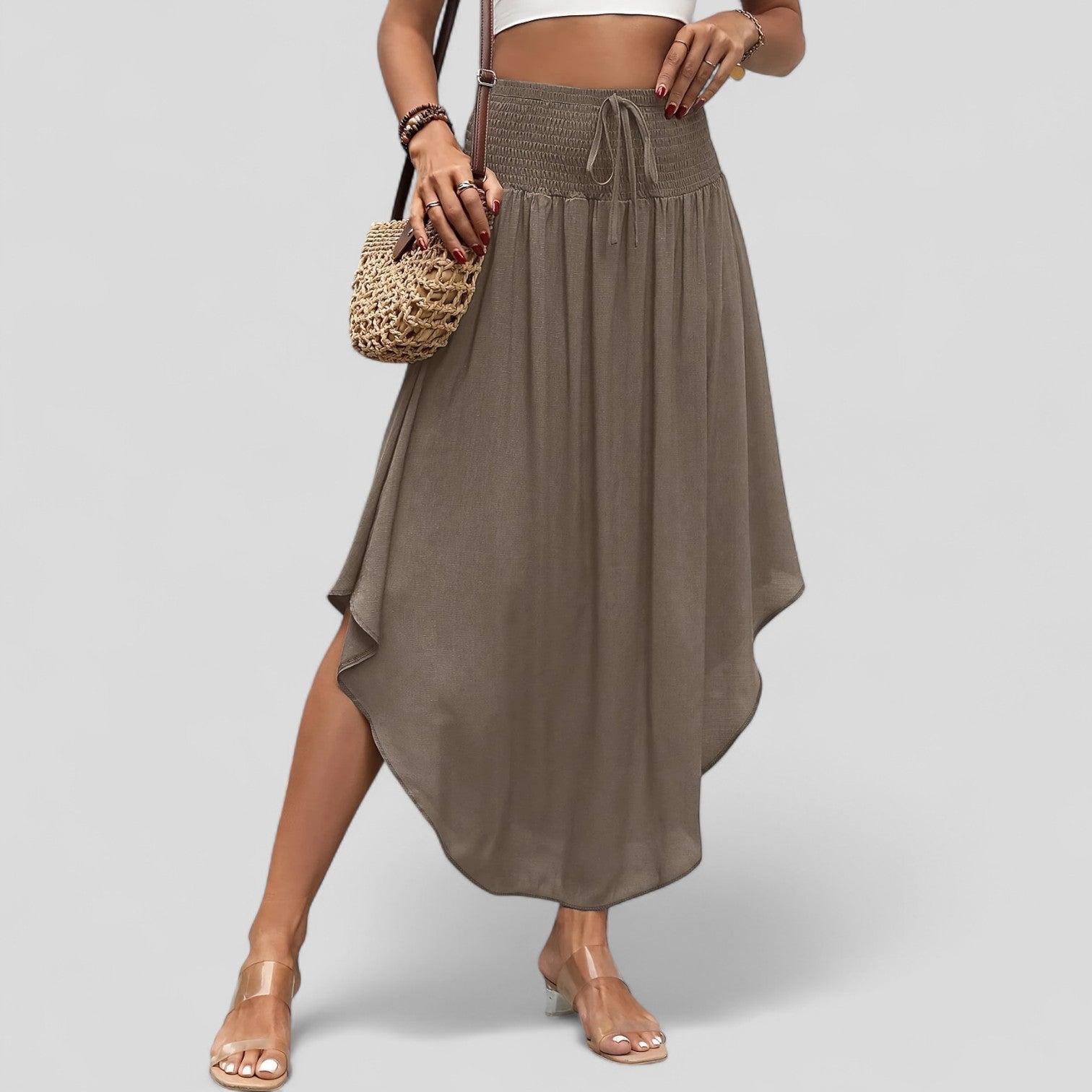 Descubre la falda perfecta para tus días relajados. Con un dobladillo asimétrico y un look desenfadado, esta prenda es imprescindible para cualquier armario.