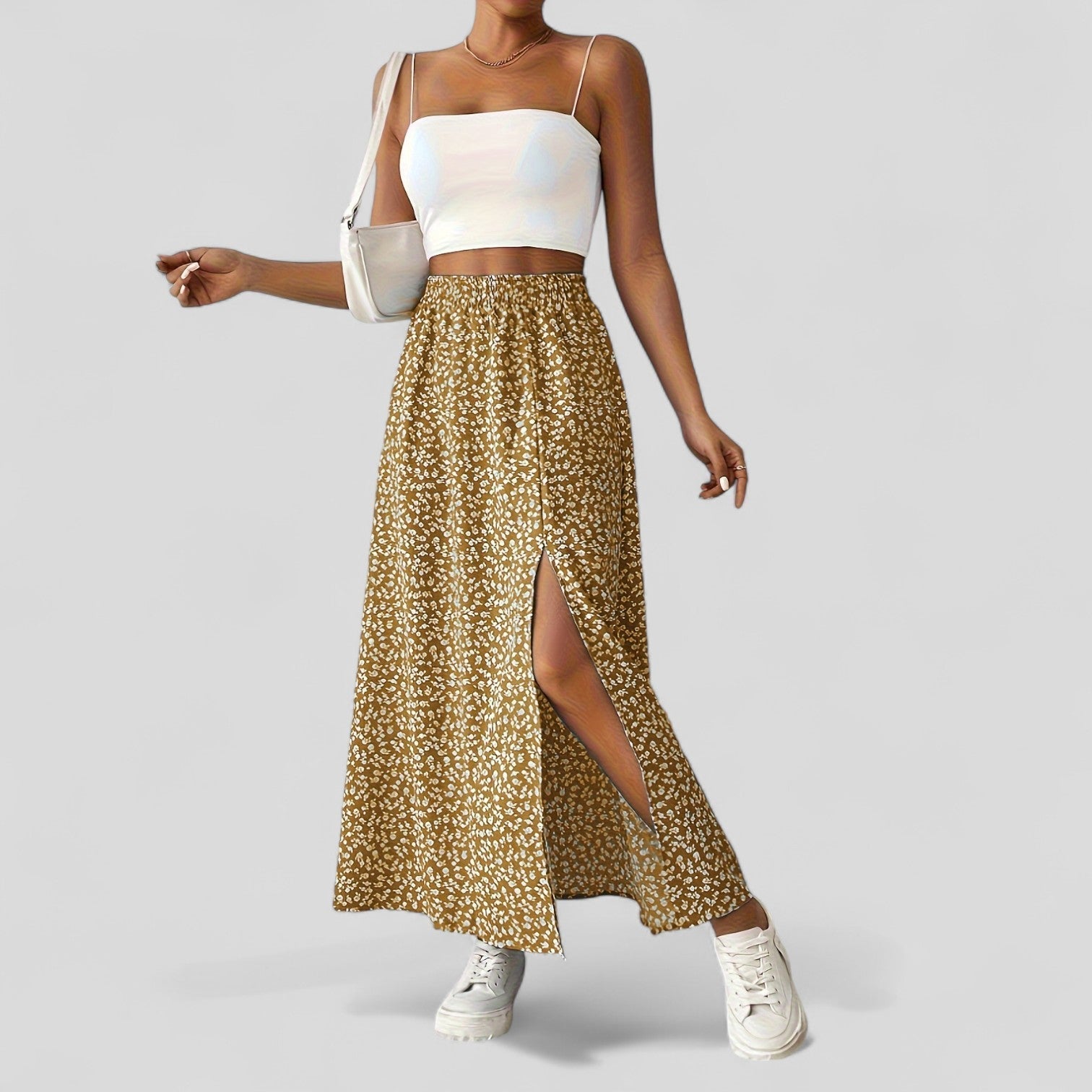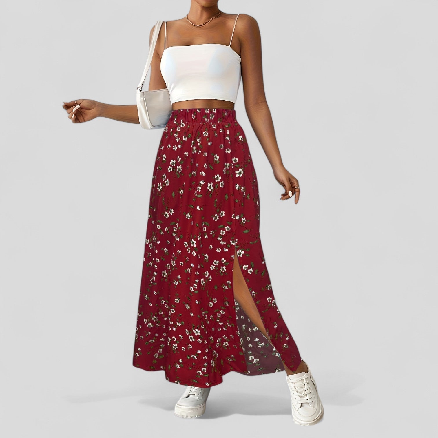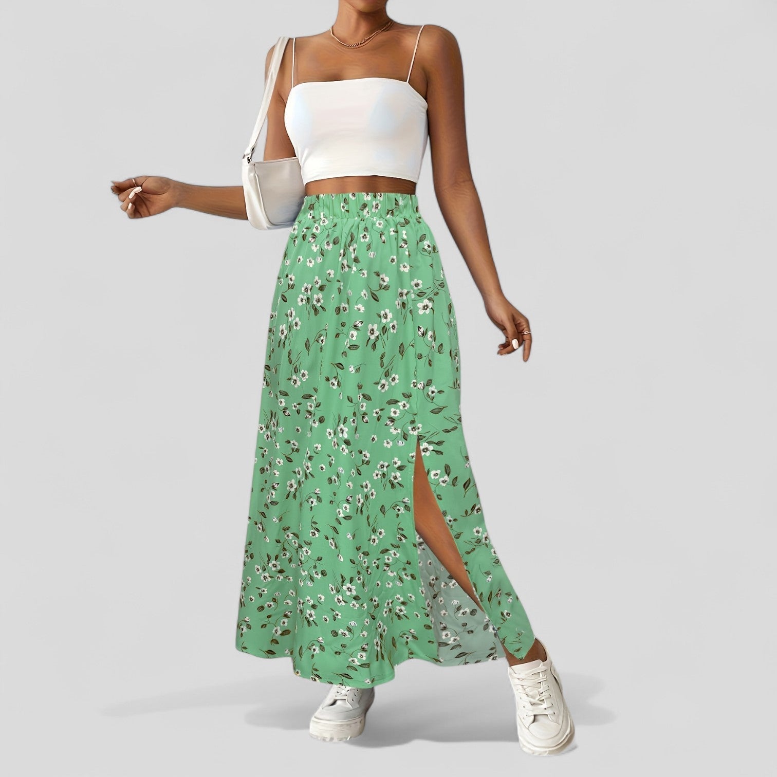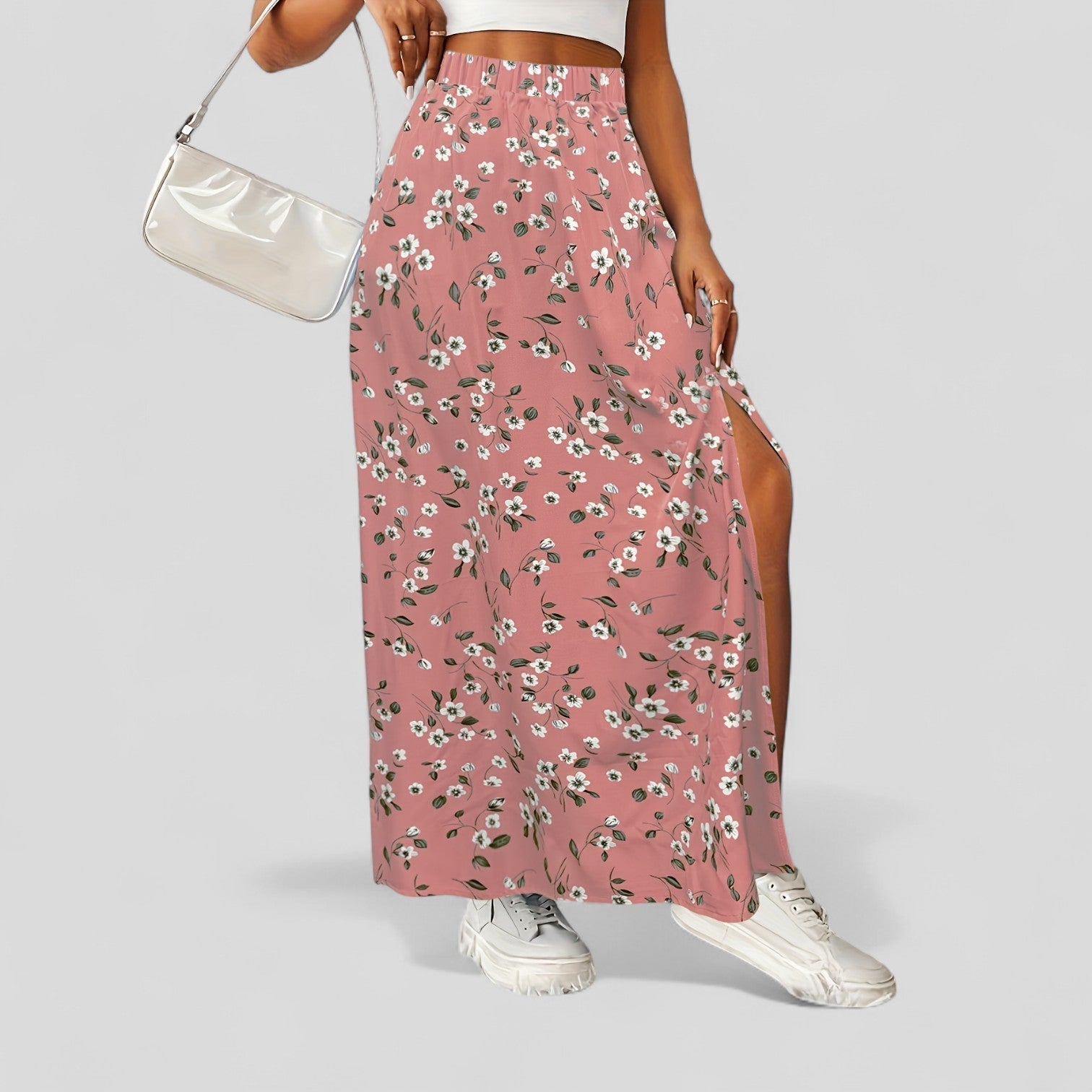 Descubre la elegancia y comodidad de nuestra maxifalda, diseñada con un delicado estampado floral y una alta abertura lateral para un look veraniego y ligero.