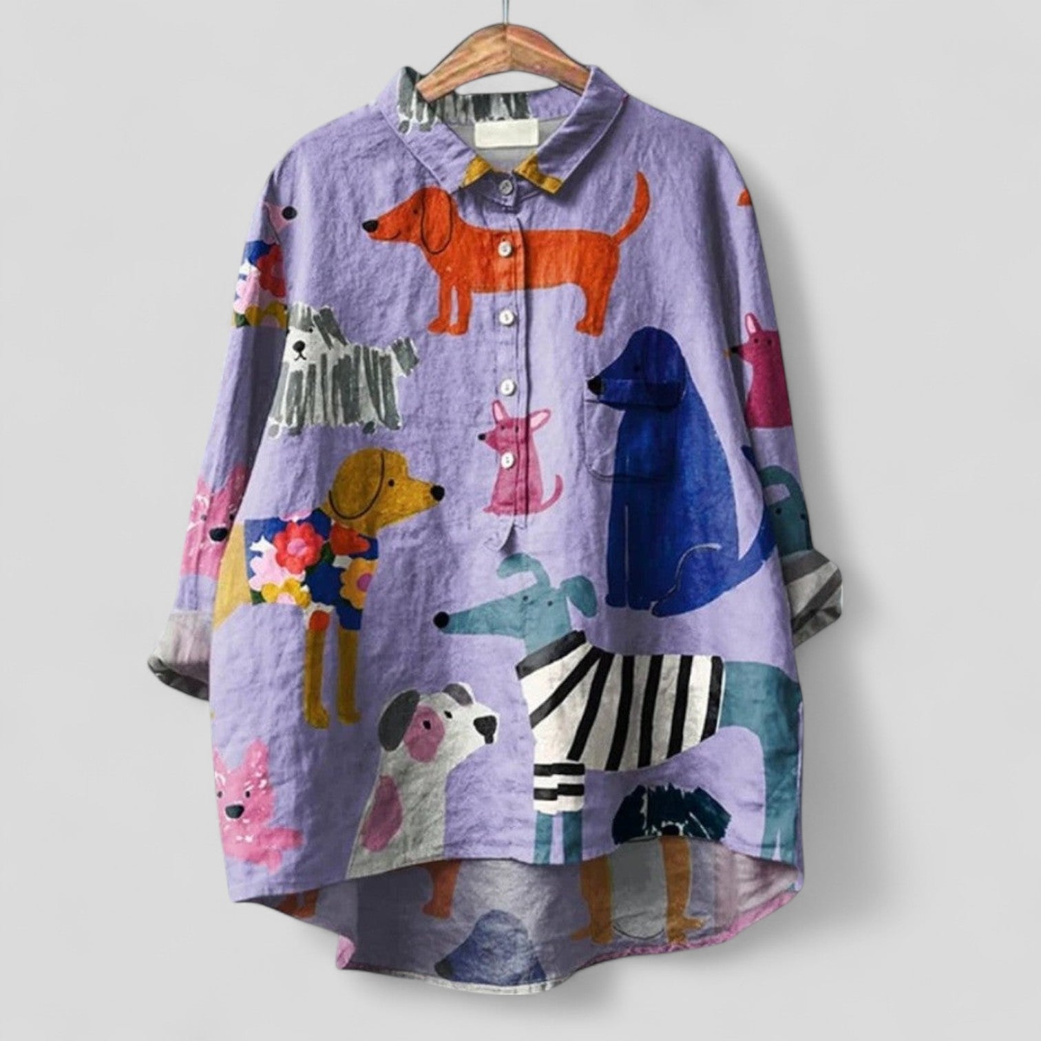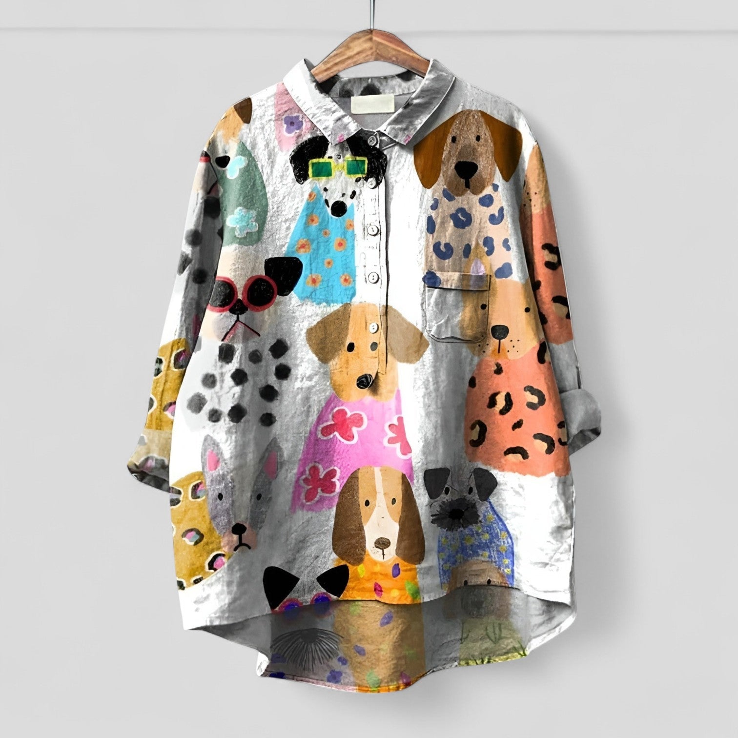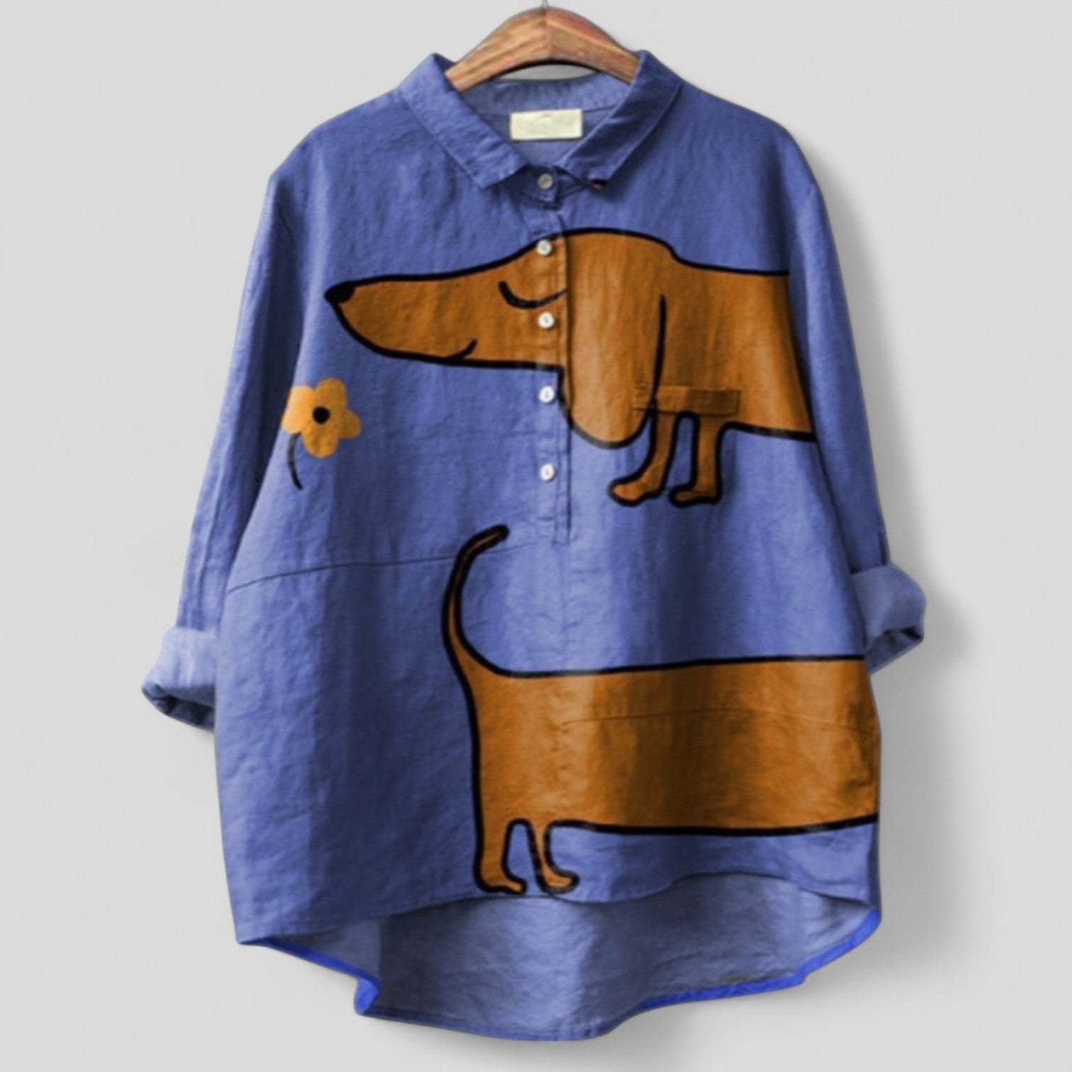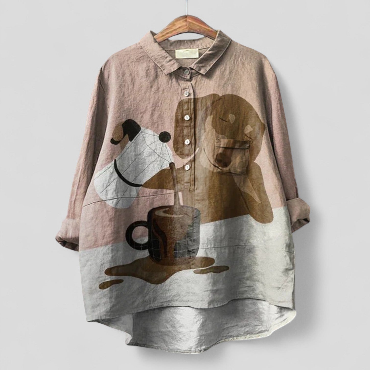 Blusa Oversize Casual de Mezcla de Lino: una prenda ligera con un encantador motivo animal y una botonera completa.
